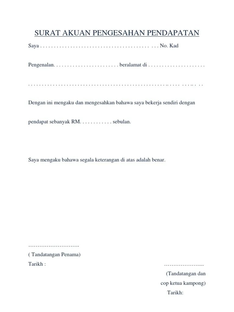 Surat akuan pengesahan pendapatan saya. Surat akuan pengesahan pendapatan adalah khusus buat individu yang bekerja sendiri dan tidak mempunyai slip gaji. Dengan ini mengesahkan bahawa saya ( bekerja sendiri / tidak bekerja ) sebagai